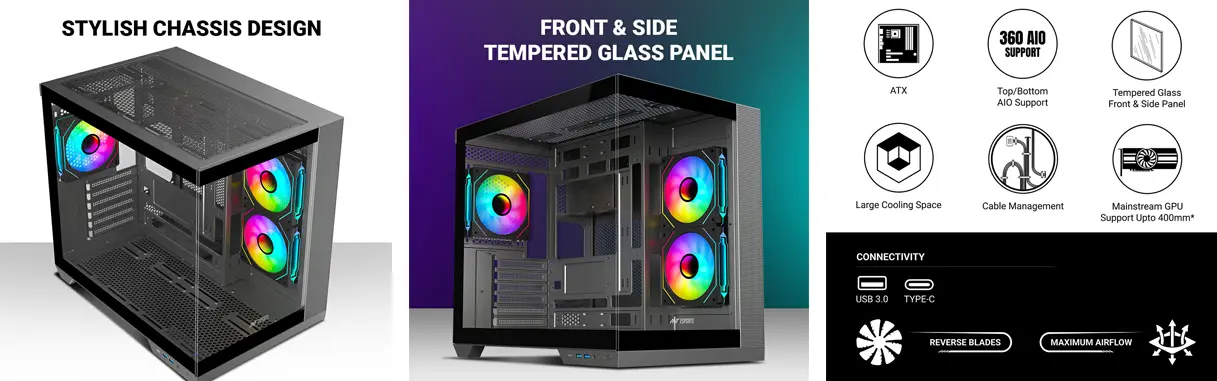 - Optimized Airflow Design:Â The Ant Esports Crystal X4 features a dual chamber design with three 120mm ARGB fans out of the box, including two reverse blade fans on the side. This configuration ensures optimum airflow, maintaining positive pressure inside the case for improved cooling efficiency without compromising on aesthetics.