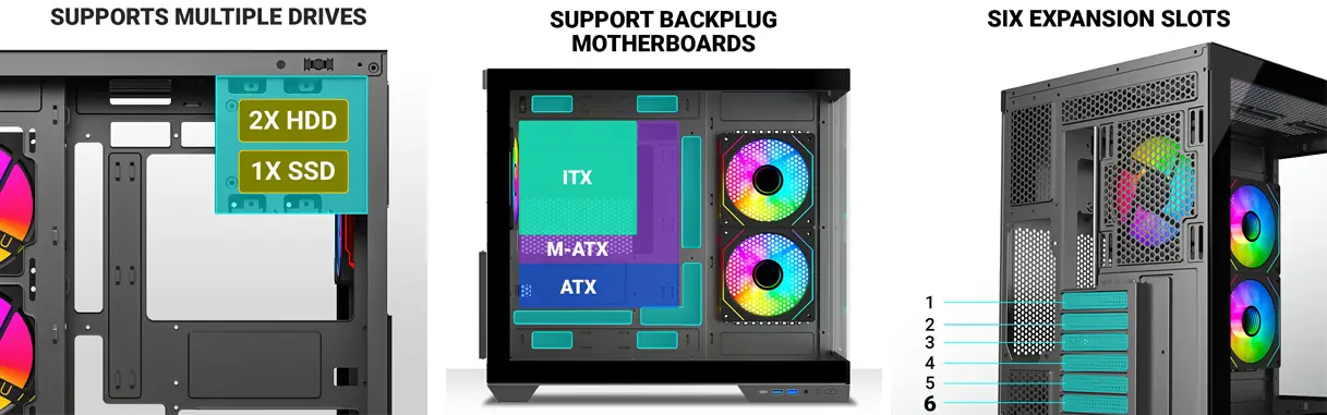 - ARGB Sync Compatibility:Â The case’s ARGB fans can be seamlessly synced with popular motherboard software such as MSI Mystic Light, Asus Aura Sync, Gigabyte Fusion RGB, and more. This allows users to customize and synchronize lighting effects across their entire gaming setup for a cohesive and visually stunning experience.