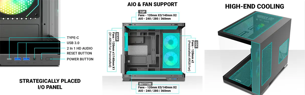 - Premium Build and Aesthetics:Â The case boasts a panoramic glass design on the front, providing a clear view of the internal components. The pre-installed fans feature an infinity mirror design on the side, adding a touch of sophistication to the gaming rig. The I/O panel, equipped with two USB 3.0 ports, a USB Type-C port, and a 3.5mm uni-jack for audio devices, ensures convenient connectivity for gaming peripherals and accessories. The power and reset buttons further enhance the user-friendly experience.