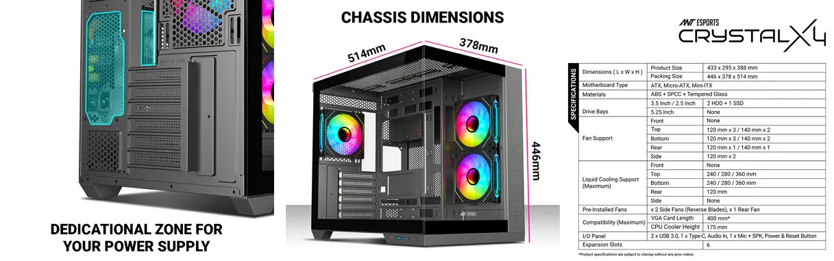 Not just limited to its stunning looks, the Crystal X4 supports dual 360mm radiators simultaneously, one on the bottom and one on top, providing extensive cooling possibilities for high-performance systems. With a generous allowance for CPU air coolers up to 175mm in height, compatibility is ensured with nearly every CPU air cooler in the market. Storage options include support for two 3.5″ HDDs or one 3.5″ HDD and one 2.5″ SSD, catering to your diverse storage needs.The IO panel is thoughtfully designed, featuring two USB 3.0 ports, one USB Type-C port, and a 3.5mm uni-jack for audio devices, along with convenient power and reset buttons. The Crystal X4’s aesthetic appeal is further enhanced by its panoramic glass design in the front, providing a glimpse into your gaming rig, while the pre-installed fans feature an enchanting infinity mirror design on the side. Elevate your gaming setup with the Ant Esports Crystal X4, where style meets performance seamlessly.