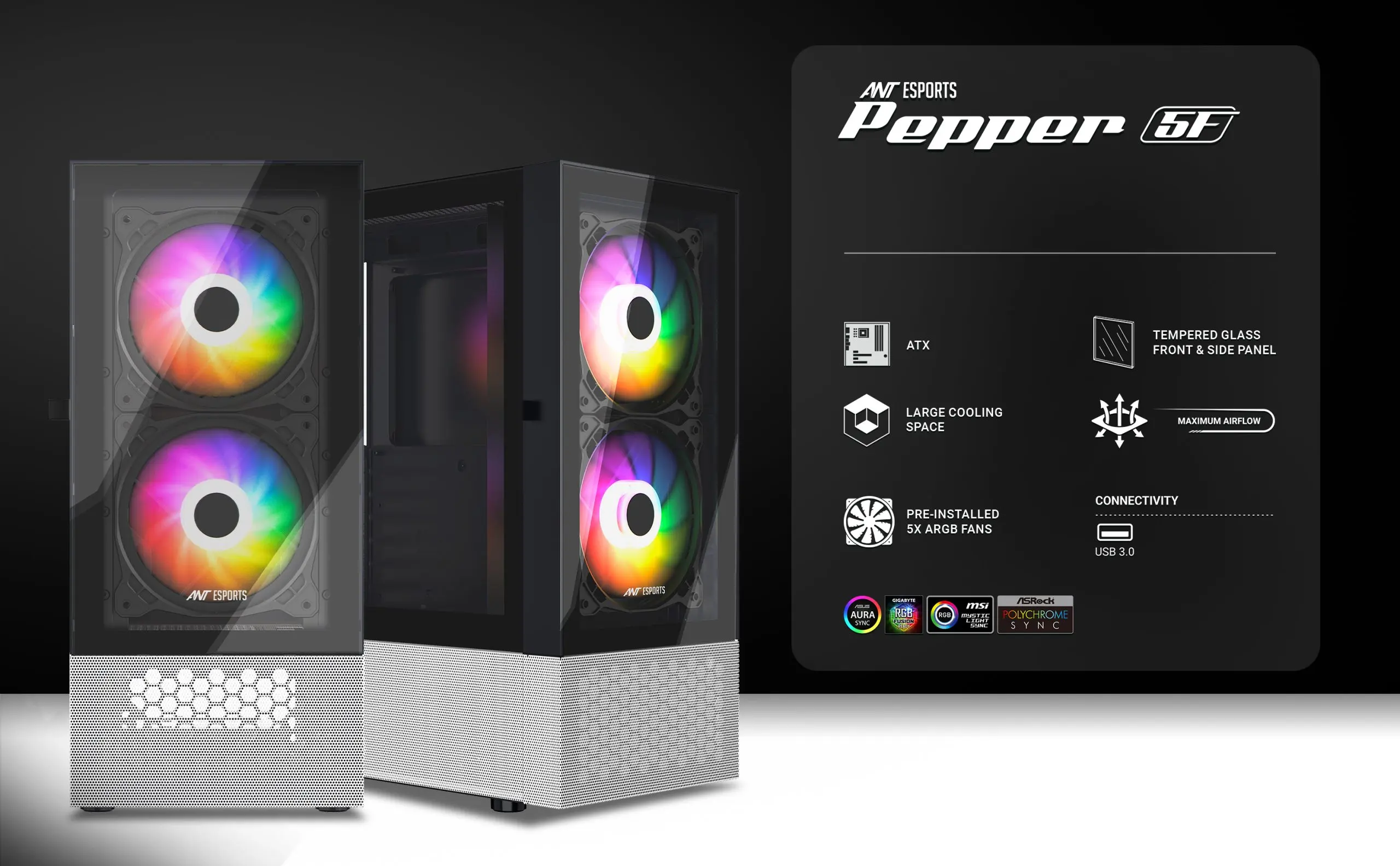Ant Esports Pepper 5F Argb Mid-Tower Computer Case with Pre-Installed five ARGB Fans. Support ATX, Micro-ATX, Mini-ITX Motherboard, 360mm Radiator, 320mm GPU length and two 3.5″ HDDs or two 2.5″ SSD.