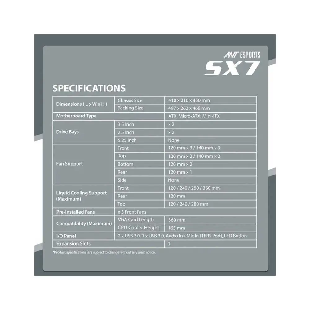 The Ant Esports SX7 is tailored made to bring together rugged looks, high airflow performance and solid build quality in one single package. Designed to house up to ATX size motherboards, makes it the ideal choice for serious gamers looking to build a high-performance system.