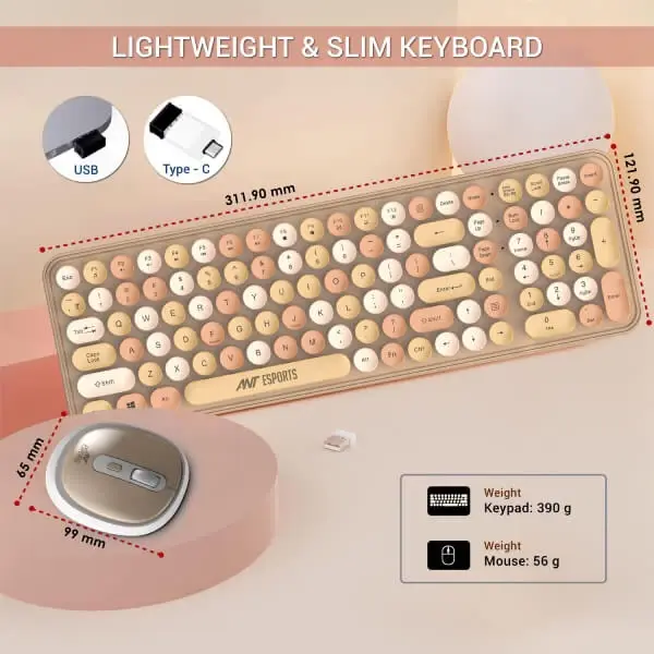 Ant Esports WKM44 Wireless is a Ultra Compact Slim with Colorful Retro Wireless Keyboard and Ergonomic Mouse Combo for Desktop/PC/Laptop/Tablets,Build in Rechargeable Battery.This Wireless Keyboard Mouse Combo is Great for Daily Use or BusinessTravel