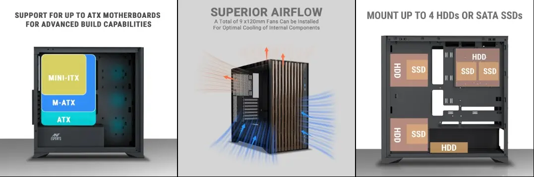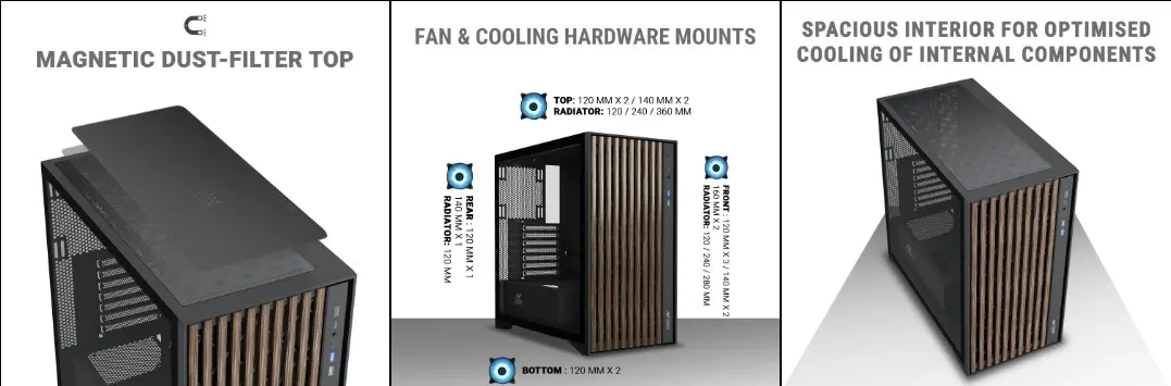 • Fan Support : 3 x 120mm / 2 x 140mm / 2 x 160mm Front, 3 x 120mm / 2 x 140mm Top, 2 x 120mm Bottom, 1 x 120mm / 1 x 140mm Rear