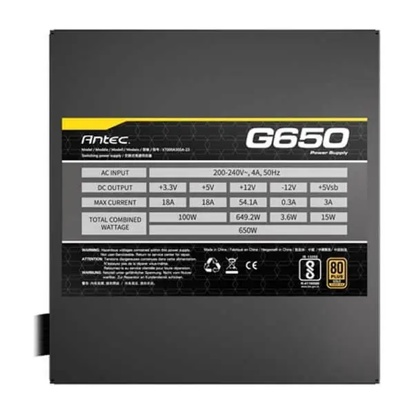 Antec G650 650 Watt 80 plus gold certified smps is a 650 watt psu that has an active pfc feature and comes with 120mm silent fan. It has 24-pin M/B x1, 8(4+4) pin CPU x2, 8(6+2) pin Pci-e x4, SATA x6 Connectors