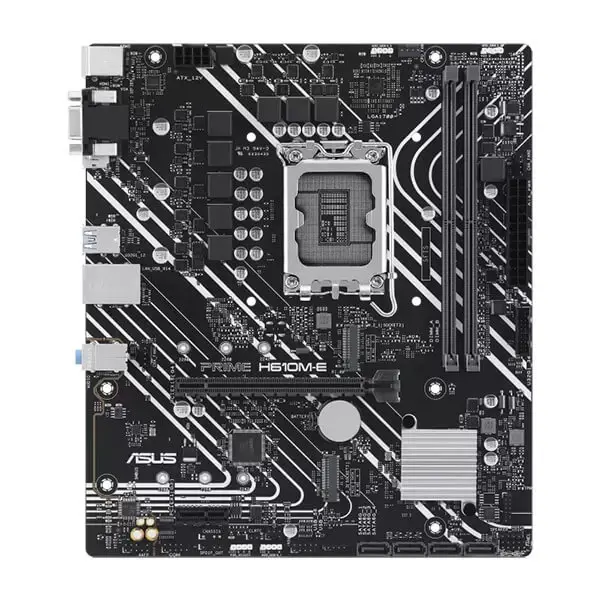 ASUS Prime H610M-E, an Intel H610 (LGA 1700) mATX motherboard with DDR5, PCIe 4.0, dual M.2 slots, Realtek 1 Gb Ethernet, DisplayPort, HDMI, VGA , USB 3.2 Gen 1 ports, SATA 6 Gbps, COM header, Aura Sync.