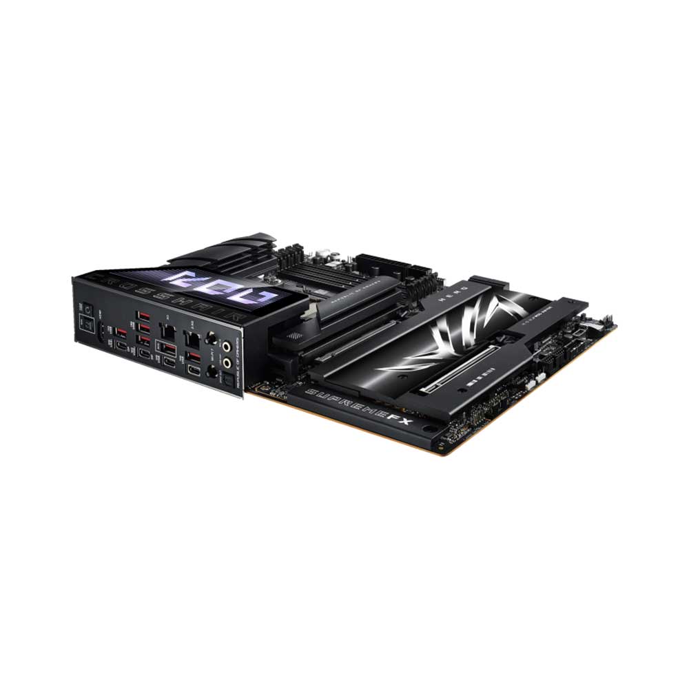 The AI PC-ready Asus ROG Crosshair X870E Hero offers unyielding power delivery, robust thermal management, hyperspeed connectivity, comprehensive PCIE 5.0 and DDR5 support to unleash the performance of AMD Ryzen™ 9000 Series processors. Dark hues predominate across this motherboard, drawing your attention to premium metallic textures, nickel-plated surfaces, sleek contours and a stereoscopic visual effect on the large M.2 and chipset heatsink. This board also features the Polymo Lighting II effect. This upgraded lighting module built into the I/O shroud provides more dynamic RGB illumination for the signature ROG logo.