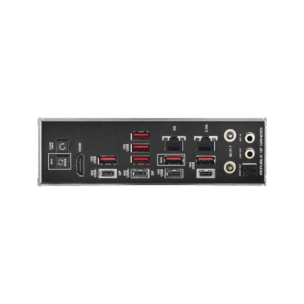 | Back Panel I/O Ports | 2 x USB4® (40Gbps) ports (2 x USB Type-C®) 8 x USB 10Gbps ports (6 x Type-A + 2 x USB Type-C®) 1 x HDMI™ port 1 x Wi-Fi module 1 x Intel® 2.5Gb Ethernet port 1 x Realtek 5Gb Ethernet port 2 x Gold-plated audio jacks 1 x Optical S/PDIF out port 1 x BIOS FlashBack™ button 1 x Clear CMOS button |