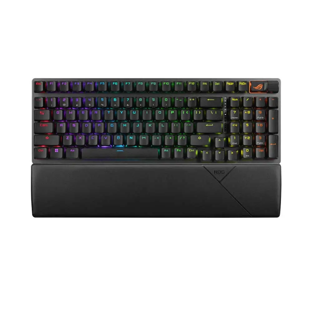 ASUS ROG Strix Scope II 96 Wireless gaming keyboard with tri-mode connection, streamer hotkeys, multifunction controls, hot-swappable pre-lubed ROG NX Snow & Storm mechanical switches, ROG keyboard stabilizers, PBT doubleshot keycaps and silicone dampening foam, three tilt angles, and wrist rest