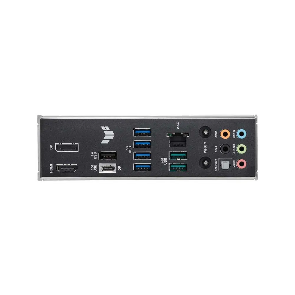 | Back Panel I/O Ports | 1 x USB 20Gbps port (1 x USB Type-C® with DP Alt mode) 2 x USB 10Gbps port (2 x Type-A) 4 x USB 5Gbps ports (4 x Type-A) 1 x USB 2.0 port (1 x Type-A) 1 x DisplayPort 1 x HDMI™ port 1 x Wi-Fi Module 1 x Realtek 2.5Gb Ethernet port 5 x Audio jacks 1 x Optical S/PDIF out port |