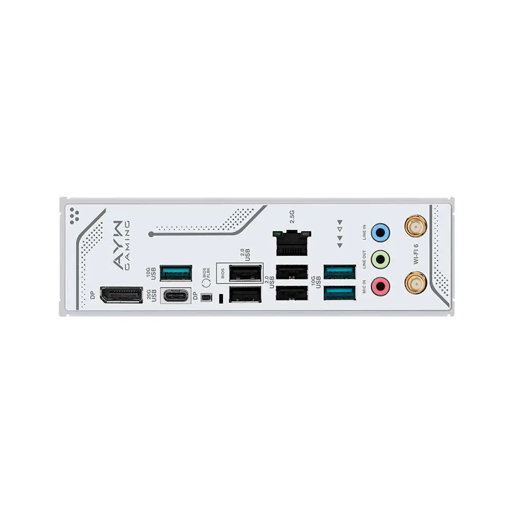 | Back Panel I/O Ports | 1 x USB 20Gbps port (1 x USB Type-C® with DP Alt mode) 3 x USB 10Gbps ports (3 x Type-A) 4 x USB 2.0 ports (4 x Type-A) 1 x DisplayPort 1 x Wi-Fi module 1 x Realtek 2.5Gb Ethernet port 3 x Audio jacks 1 x BIOS FlashBack™ button |