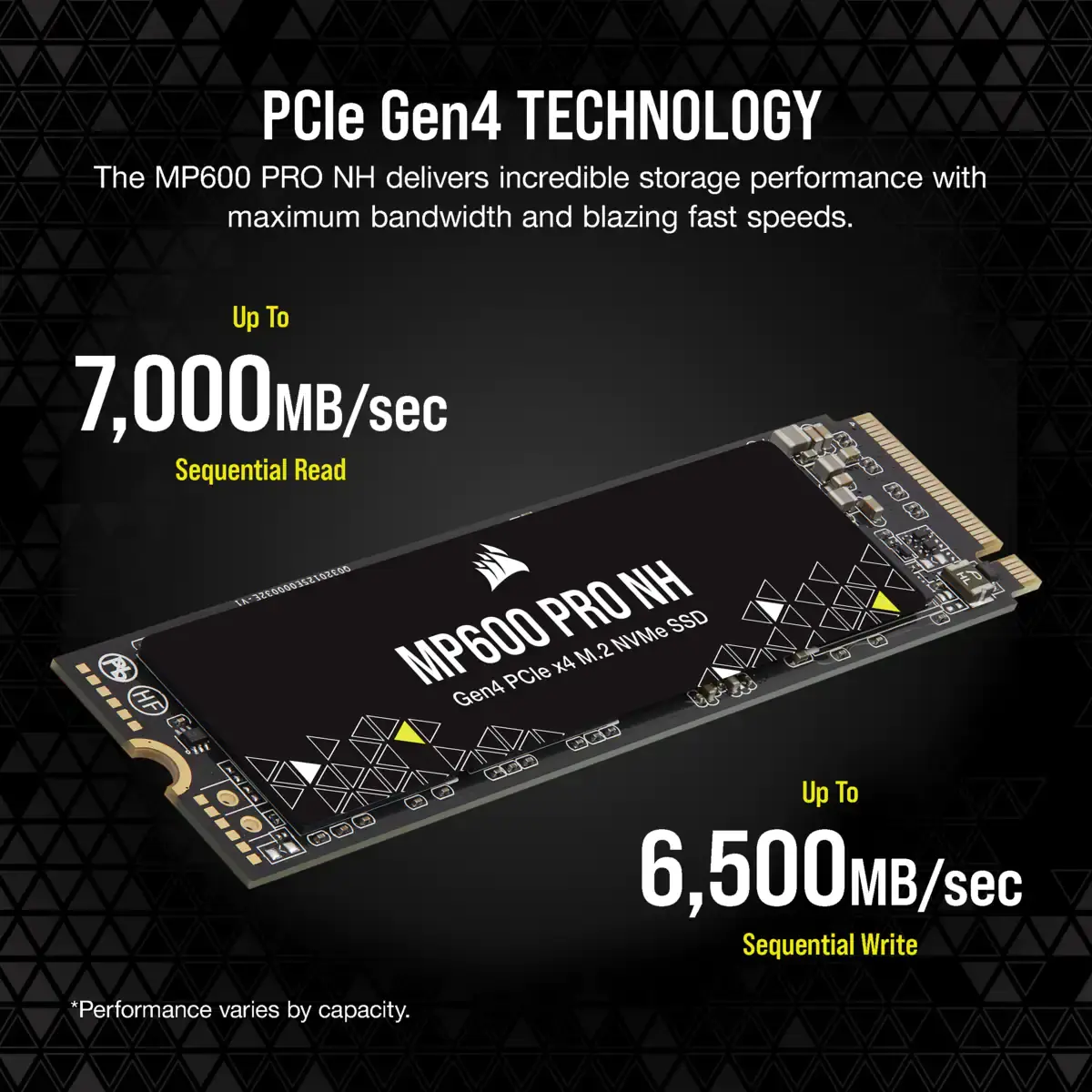 The CORSAIR MP600 PRO NH uses Gen4 PCIe technology to achieve unbelievably fast sequential read speeds up to 7,000MB/sec and write speeds up to 5,700MB/sec.