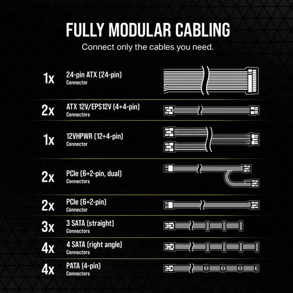 Keep cable clutter down by connecting only the cables your system needs and nothing else. Five universal 8-pin connectors can be used with any 8-pin cable, satisfying all the power needs of modern motherboards and GPUs.