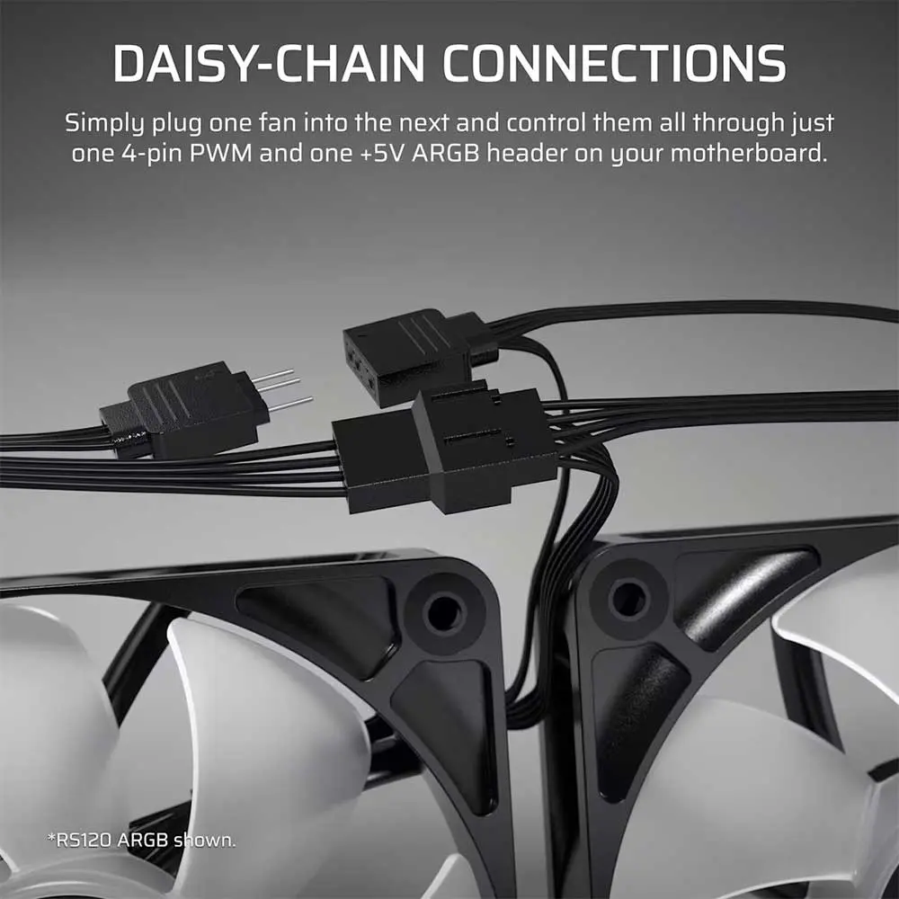 Delivering vibrant RGB lighting with a flawless aesthetic, CORSAIR RS120-R ARGB Fans feature reverse rotors, making them ideal intake fans with easy daisy-chain 4-pin PWM and +5V ARGB motherboard control.