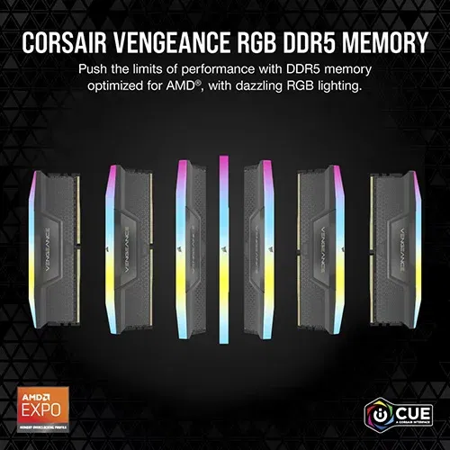 Corsair Vengeance RGB 64Gb DDR5 memory delivers DDR5 performance, higher frequencies, and greater capacities optimized for Intel motherboards while lighting up your PC with dynamic, individually addressable ten-zone RGB lighting.