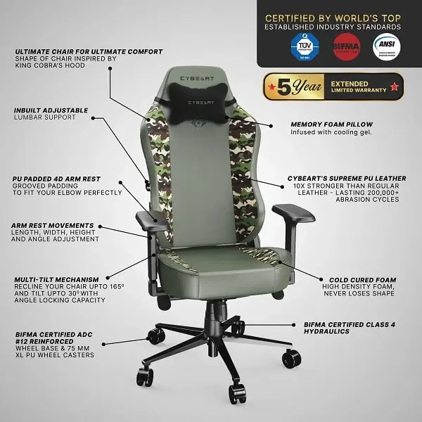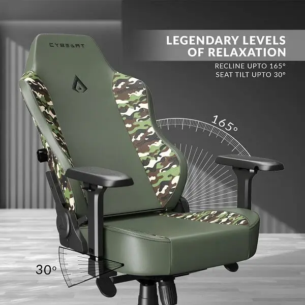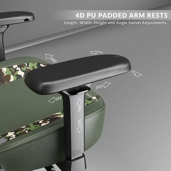 Cybeart Apex Forest Camo Chair, featuring 4D adjustable armrests, built-in lumbar support, memory foam pillow, supreme PU leather and multi-tilt mechanism for customized relaxation. it’s perfect for gaming, working from home, reading and drafting.