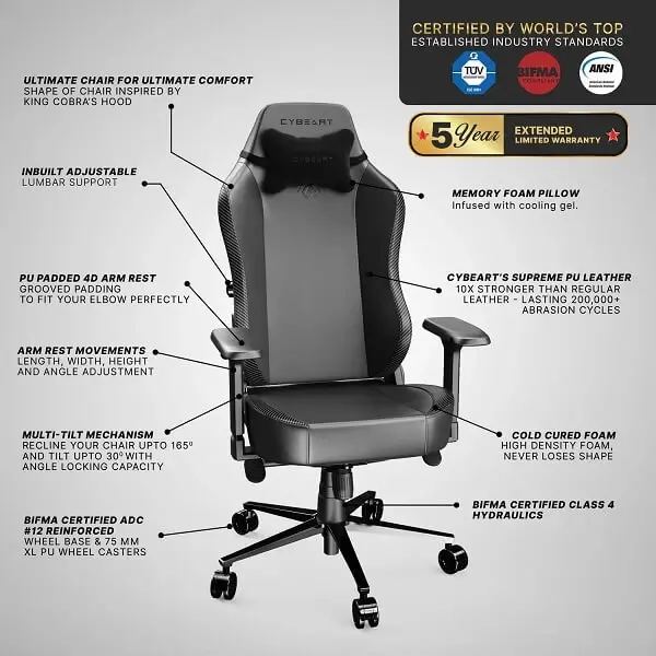 CYBEART SUPREME PU LEATHER – Certified by TÜV SÜD to last more than 200,000 Abrasion Cycles. 10X more stronger and durable than the industry standard. All the tests are carried out by keeping environmental factors into consideration such as Humidity, perspiration or body sweat, color fastness to light & rubbing etc.
