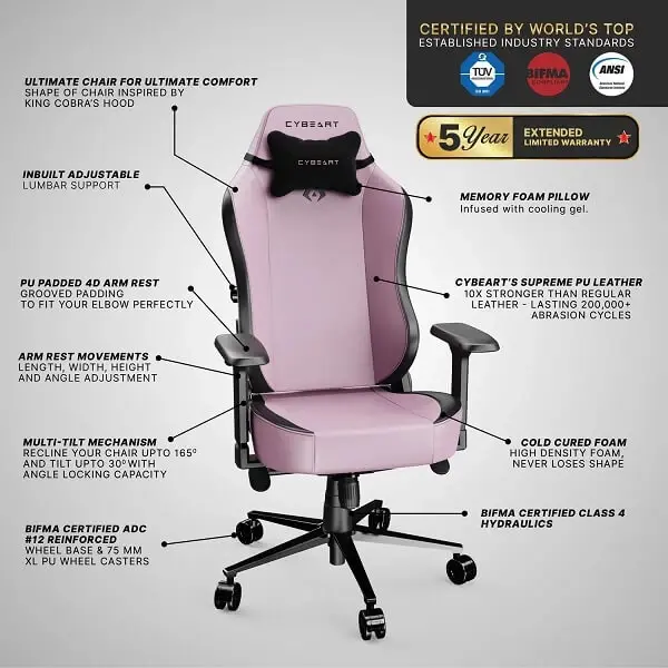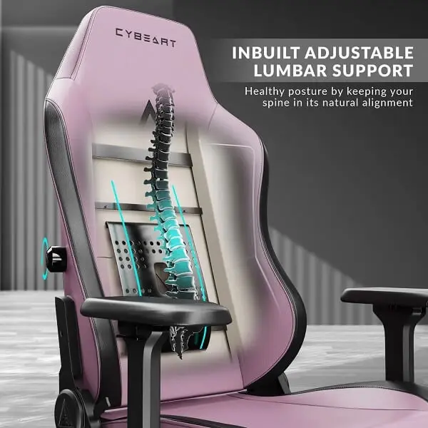 Cybeart Apex Pretty Pink Chair, featuring 4D adjustable armrests, built-in lumbar support, memory foam pillow, supreme PU leather and multi-tilt mechanism for customized relaxation. it’s perfect for gaming, working from home, reading and drafting.