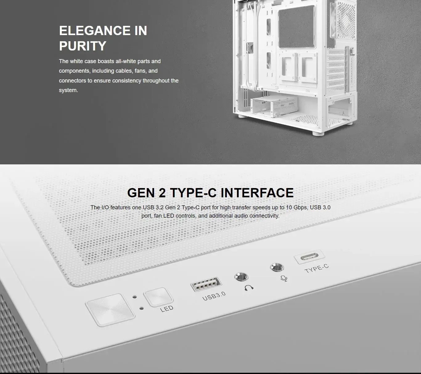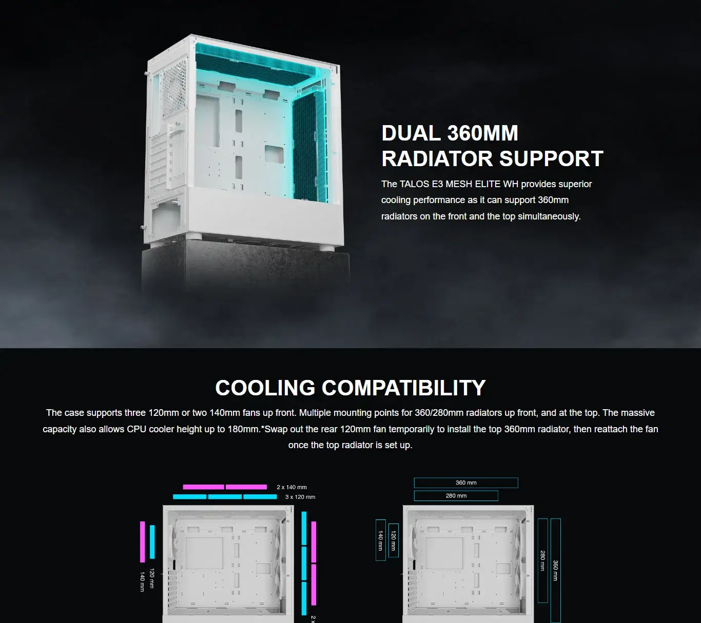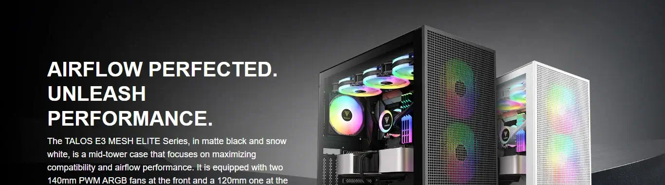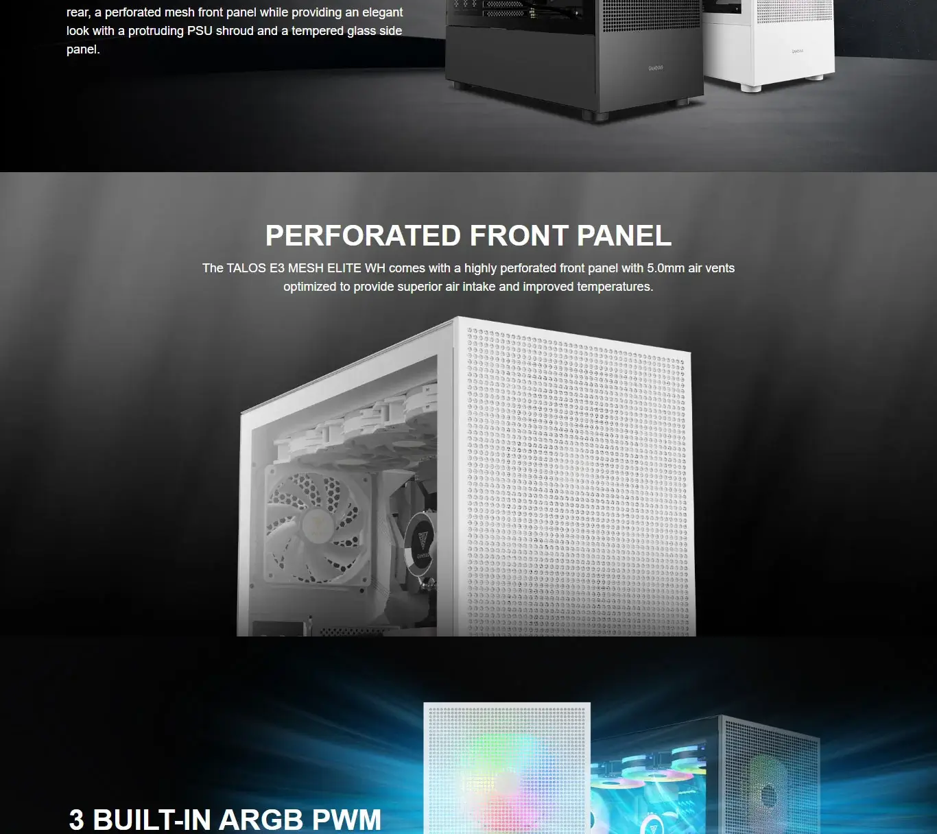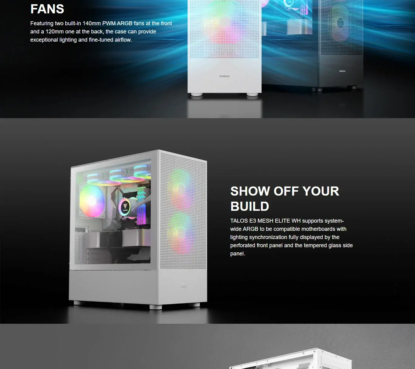 Gamdias Talos E3 Mesh Elite Argb WH Desktop Cabinet is featuring supports system-wide ARGB to be compatible motherboards with lighting synchronization fully displayed by the perforated front panel and the tempered glass side panel.