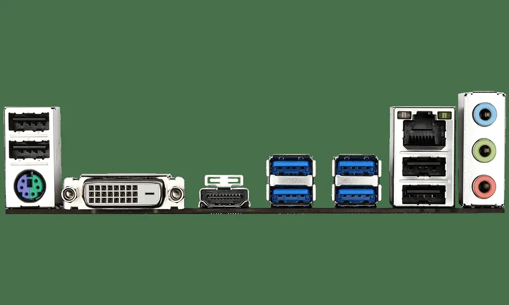 | Back Panel Connectors | 1 x PS/2 keyboard/mouse port 1 x DVI-D port 1 x HDMI port 4 x USB 3.1 Gen 1 ports 4 x USB 2.0/1.1 ports 1 x RJ-45 port 3 x audio jacks |
