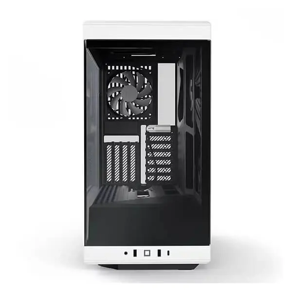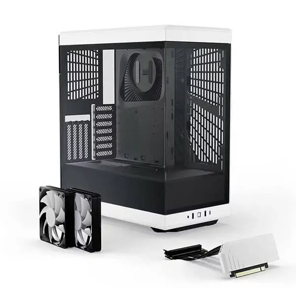 The Hyte Y40 Mid-Tower Atx (Black And White) PC Case featuring panoramic tempered glass design to showcase internal components. It includes two pre-installed 120mm fans and a PCIE 4.0 Riser Cable. This cabinet has an exclusive Vertical GPU Support feature