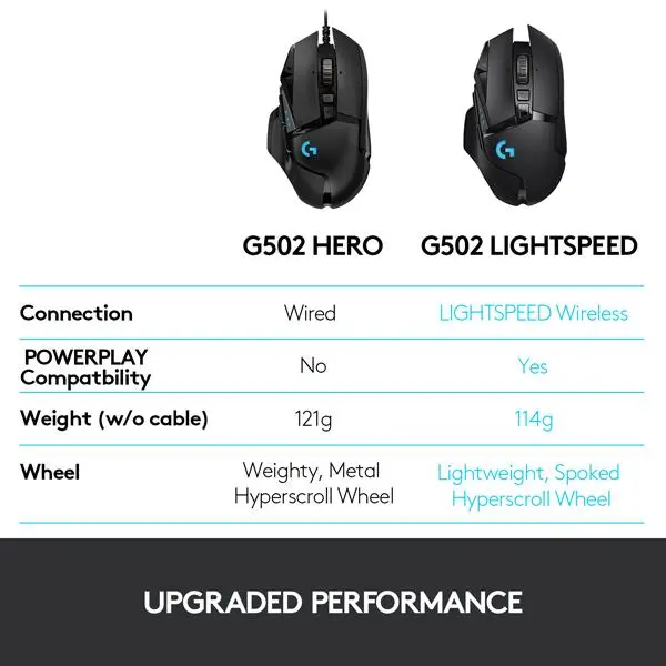 G502 LIGHTSPEED was designed to be the ultimate G502 gaming mouse ever made. It keeps the exact same ID and feature set of the original, but is completely re-engineered to incorporate our most recent innovations. The internal structure features the same thin wall design and advanced endoskeleton as the PRO Wireless mouse for a 7-gram weight reduction. And the same industry-leading wireless technologies: LIGHTSPEED, HERO 16K and POWERPLAY.