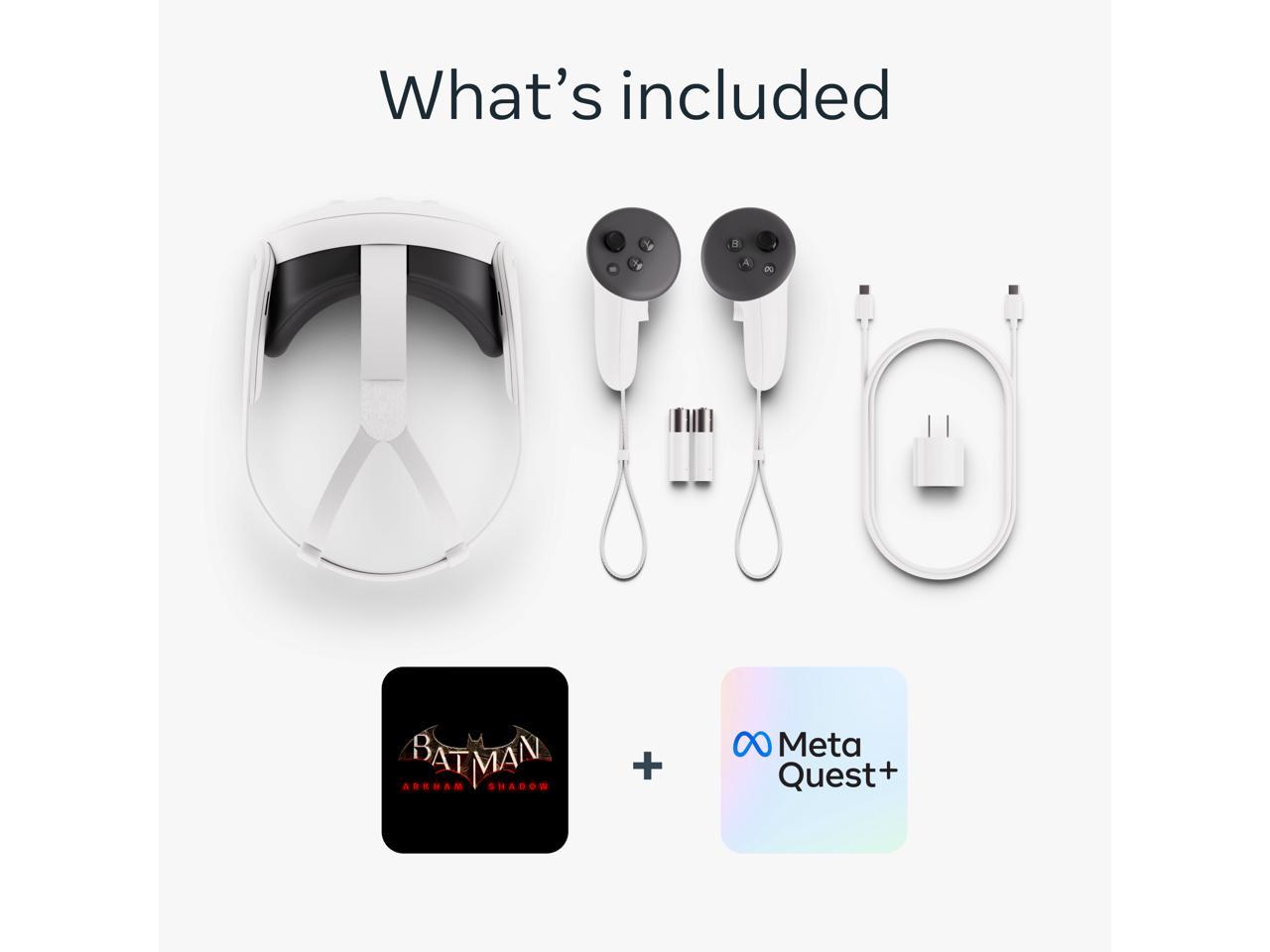 | Package Contents | Meta Quest 3s headset Adjustable Standard Facial Interface (pre-installed) 2 Meta Quest Touch Plus Controllers (with AA batteries included) 2 Wrist Straps (preinstalled) Power adaptor Charging cable |