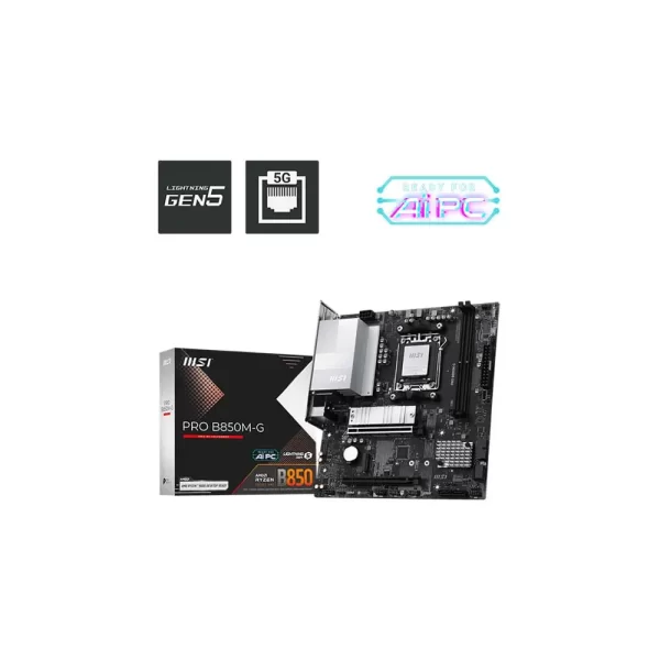 MSI Pro B850M-G offers a simple design with a harmonious silver color scheme that perfectly matches both white and black PC builds. It is engineered with many exclusive features of MSI, 5G LAN, PCIe 5.0 M.2 with M.2 Shield Frozr, and EZ PCIe Clip II, ready for the AMD Ryzenâ„¢ 9000 series processors.