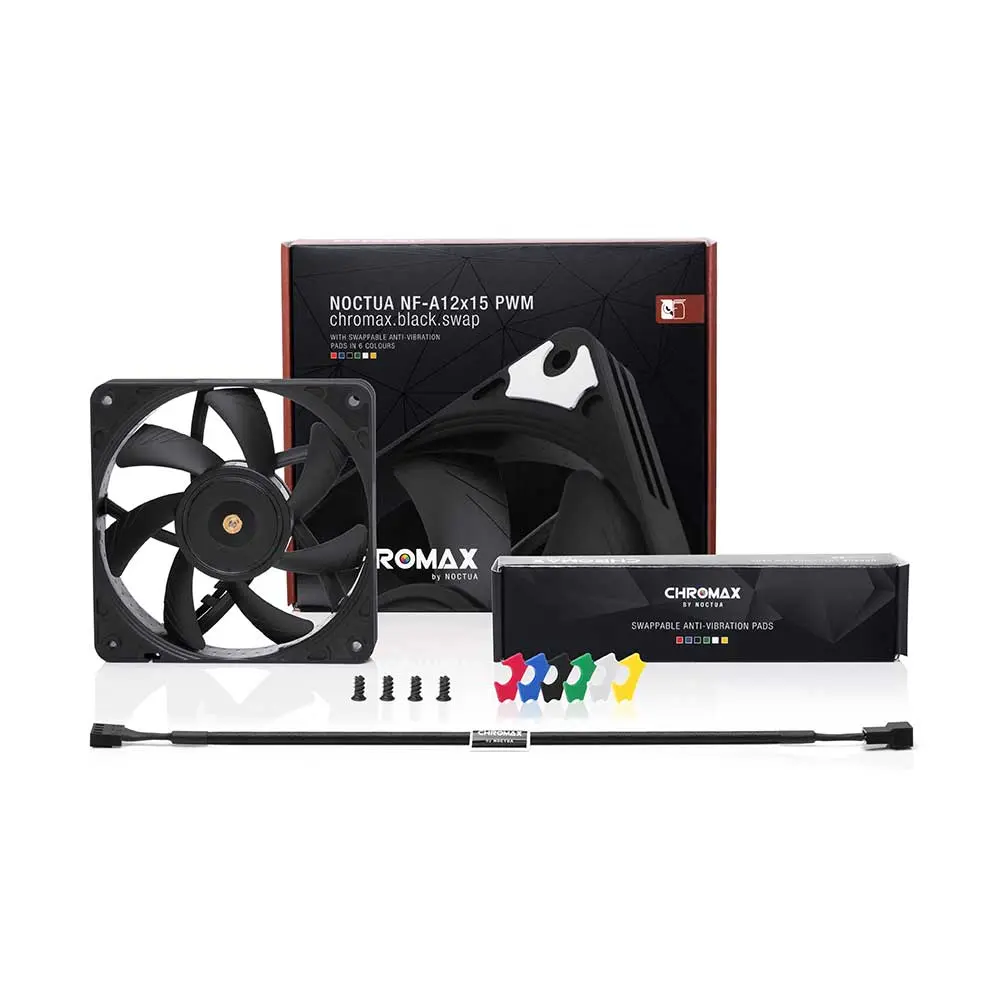 Having received dozens of awards and recommendations from international hardware websites and magazines, the Noctua NF-A12x15 Chromax Black Swap has established itself as a default choice when it comes to premium-quality slim 120mm fans. The chromax.black.swap edition combines the NF-A12x15’s signature quiet cooling performance with an attractive all-black design and a bundle of self-adhesive red, white, blue, green, yellow and black anti-vibration pads that allow the colour-customisation of the fan to match individual build colour schemes. Topped off with Noctua’s trusted premium-grade SSO2 bearing, more than 150,000 hours MTTF and 6-year manufacturer’s warranty, the NF-12×15 PWM chromax.black.swap is the perfect choice for all users who value individual, focused build aesthetics just as much as class-leading quality and performance.