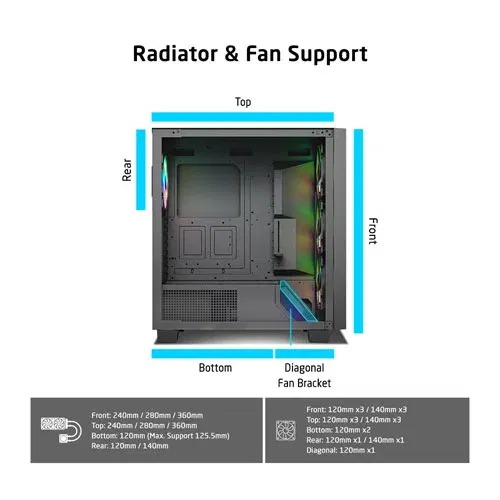 | MAX RADIATOR SUPPORT | 120mm,140mm,240mm,280mm,360mm |
