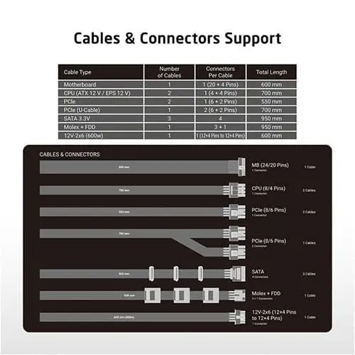 The XP-1000 P has enough connectors for your new gaming PC or Workstation, along with 3x Molex and 12x SATA Power and 1x FDD Connectors 1. 1x 24-Pin ATX(Motherboard) Power (600mm) Cable 2. 2x 8(4+4)-Pin EPS(CPU) Power (650mm) Cables 3. 2x 8(6+2)-Pin PCIe Power (550mm), 1x 8(6+2)-Pin PCIe Power U-Cables 4. 1x 16(12+4)-Pin 12VHPWR (600mm) Cable