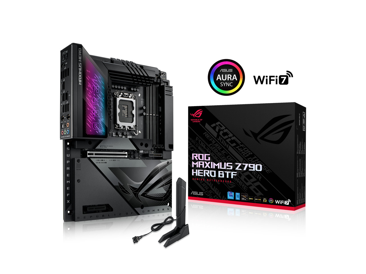 ROG MAXIMUS Z790 HERO BTF Intel® Z790 LGA 1700 ATX motherboard with hidden-connector design and graphics card high-power slot for clean cable management 20+1+2 power stages DDR5 support with AEMP II and ASUS ROG Hyperion GR701 BTF Edition oc