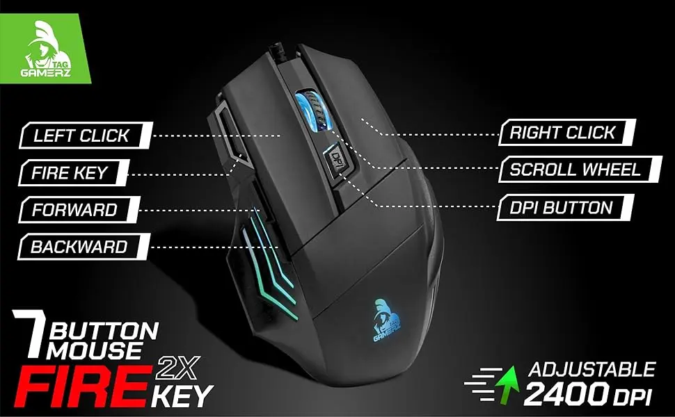 - Mouse: 7 Total Buttons Mouse With Dedicated Fire 2X Button And Upto 2400 DPI Sensitivity Option.