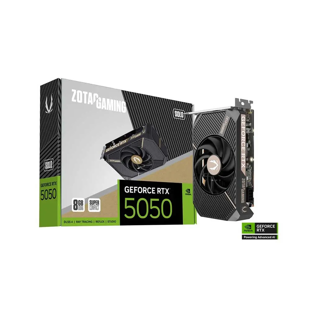 The ZOTAC GAMING GeForce RTX 5050 SOLO is a super compact graphics card powered by NVIDIA‘s cutting edge Blackwell Architecture, DLSS4 and 8GB of GDDR6 memory. With a single-fan and a dual-slot footprint, the SOLO is ready to deliver big performance in a minuscule footprint.
